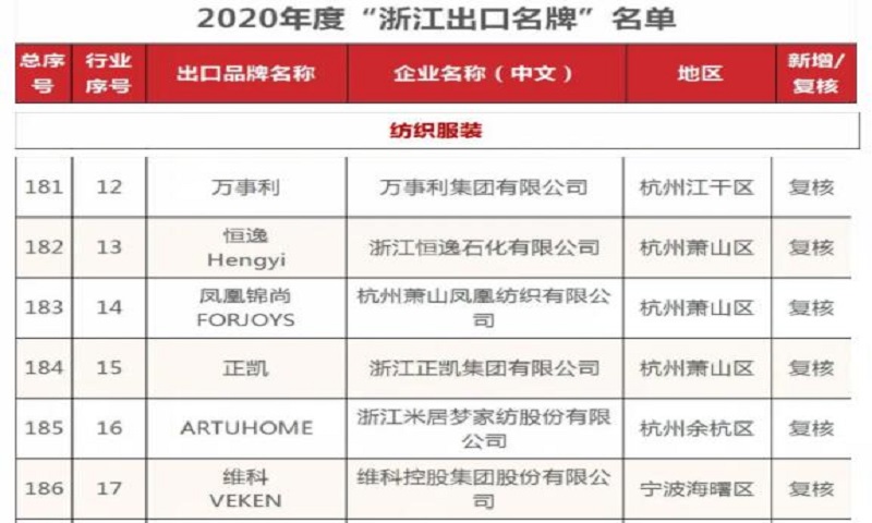 維科(VEKEN)品牌獲評2020年度“浙江出口名牌”