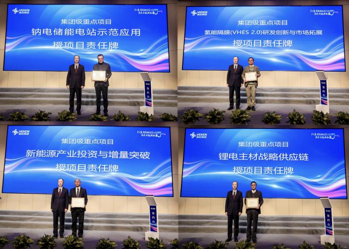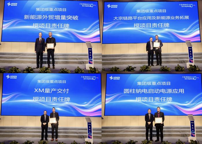 會上,鈉電儲能電站示范應用、氫能隔膜( VHES 2.0)研發創新與市場拓展、新能源產業投資與增量突破、鋰電主材戰略供應鏈、新能源外貿增量突破、大宗鏈路平臺應用及新能源業務拓展、XM量產交付、圓柱鈉電啟動電源應用等八個集團級重點項目的責任人從項目意義、項目目標、團隊成員、項目工作措施、項目存在風險及應對、項目里程碑節點、項目資源需求等方面對項目進行了解碼發布。集團考薪委主任陳總,高新董事長、維科技術考薪委主任呂總對重點項目分別作了對賭考核要求,項目責任人簽署了責任狀,并授予了重點項目責任牌。