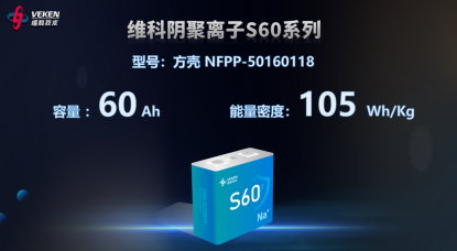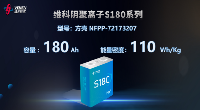 維科聚陰離子S180系列,型號為方殼 NFPP-72173207,容量180Ah;維科陰聚離子S60系列,型號為方殼 NFPP-50160118,容量60 Ah。兩款聚陰離子鈉電池在多個關鍵指標上達到行業領先水平: