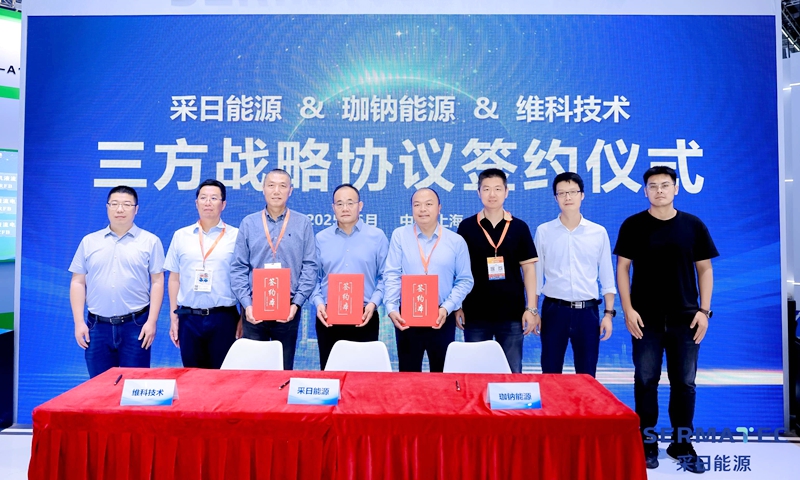 近日,維科技術股份有限公司與上海采日能源科技有限公司、深圳珈鈉能源科技有限公司在國家會展中心(上海)SNEC展上簽署《三方戰略合作協議》,宣布在鈉離子電池儲能技術研發、產品推廣及產業鏈協同等領域達成深度合作,共同開啟鈉電儲能產業高質量發展新篇章。
