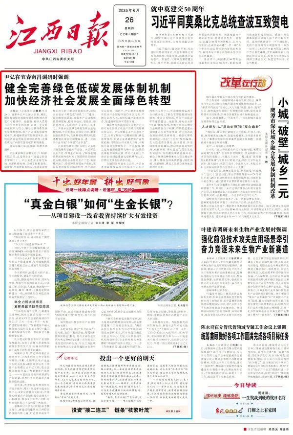 大江網/大江新聞客戶端訊 江西日報全媒體記者魏星報道:6月25日,省委書記尹弘深入宜春、南昌,圍繞推進綠色低碳發展體制機制改革進行專題調研。他強調,要深入貫徹習近平生態文明思想,以進一步全面深化改革為動力,健全完善綠色低碳發展體制機制,提升產業綠色低碳發展水平,構建碳排放雙控制度體系,加快經濟社會發展全面綠色轉型,讓綠色成為江西高質量發展的鮮明底色。