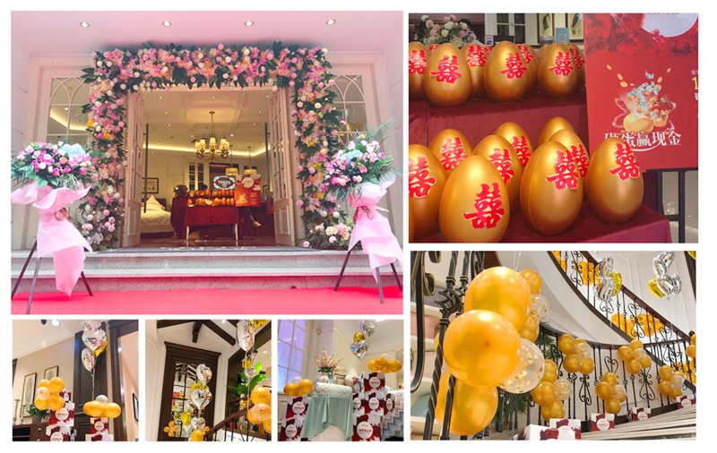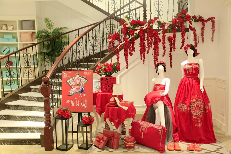 為帶給顧客更直觀舒適的消費體驗,在空間設計上,維科家紡和義店二樓婚慶家紡場景展示區摒棄了家紡行業傳統高柜+展床以求陳列面最大化的方式,將300余平方的空間分隔成7個實景樣板間,真實體現婚慶床品在日常家居生活中的應用效果,也能滿足顧客在選購婚慶床品的同時,一站式解決對婆婆禮、長輩禮以及婚慶小件(子孫桶、火銃、虎頭鞋等)的需求。該區域設置了一大一小兩個洽談區,配備了舒適的沙發以及精致的茶歇,以供顧客能夠坐下來向導購詳細了解床品的信息,以優質的消費體驗,滿足顧客的選購需求。在陳列布置上,當季新品醉紅妝、子孫滿堂、胭脂醉,熱銷品百子納福、麒麟賀滿堂等都直接鋪設于房間內,并搭配生活化的情景道具,供顧客選購。