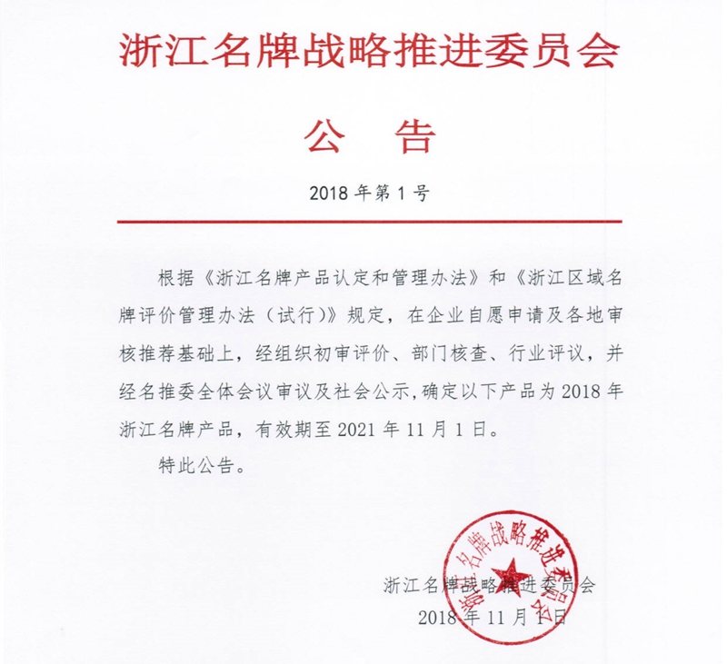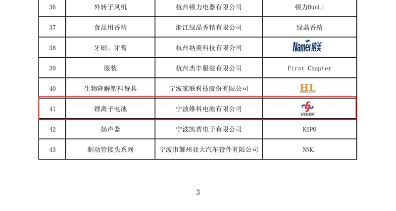 2018年11月1日、浙江省品質(zhì)技術(shù)監(jiān)督局が授権して、浙江省ブランド戦略推進(jìn)委員會(huì)が選出した「浙江ブランド製品」のリストが盛大に発表され、寧波維科電池有限會(huì)社が申告した「リチウムイオンバッテリー」が「浙江ブランド製品」と認(rèn)定された。